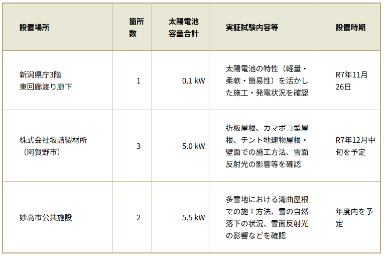 今回の実証にはSOLABLE、PXP、坂詰製材所が参画し、PXPが製造するカルコパイライト太陽電池を使って検証を進める。新潟県庁3階東回廊では0.1kWを設置し、軽量性と柔軟性を活かした施工性と発電状況を確認する計画。坂詰製材所では折板屋根、カマボコ型屋根、テント地など多様な屋根で計5.0kWを設置し、雪面反射光の影響や固定方法などを検証する。妙高市の公共施設では5.5kWを設置し、湾曲屋根における施工方法や積雪の自然落下状況を調べる。