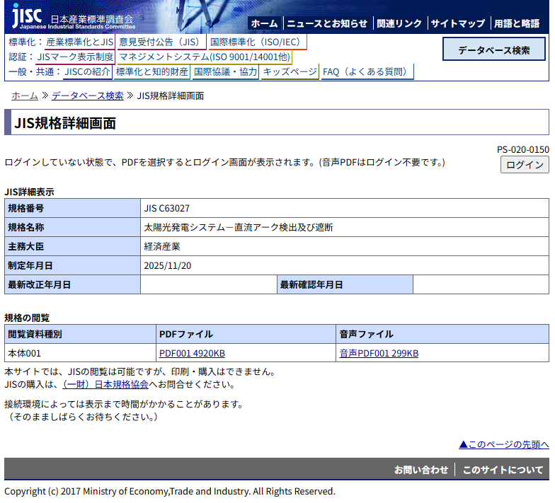 日本産業標準調査会が、太陽光発電システムにおける直流アークの検出と遮断を扱う新規格「JIS C63027」を制定した。国際規格IEC63027を基としつつ、国内の制度や技術に合わせて修正を加えた内容で、2025年11月20日付で経済産業大臣により制定された。規格は直流1500V以下のPV回路を対象に、直列アーク故障を想定した試験シナリオや試験手順、機器の応答時間などを定めている。アークに起因する火災リスクへの対策強化が求められる中、国内での統一的な安全基準整備に向けた重要な基盤となる。