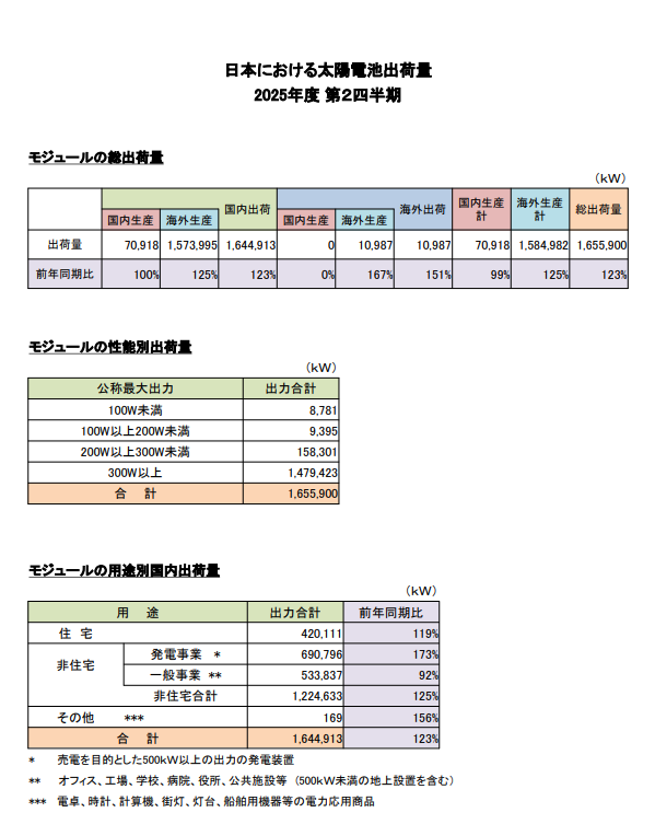 日本における太陽電池出荷量(2025年度 第2四半期)