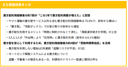 【市況】ヤマト運輸:置き配利用の実態調査、利用増加と不安要因の二面性が鮮明に