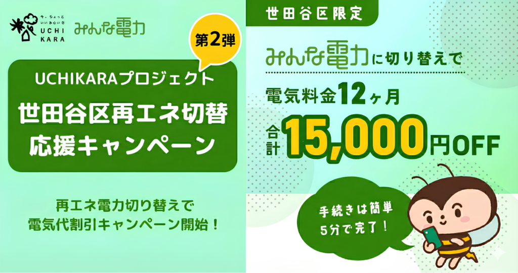 UPDATERが提供する再エネ電力「みんな電力」は、世田谷区の脱炭素施策「UCHIKARAプロジェクト」と連携し、12月1日から区民向けの再エネ切替応援キャンペーン第2弾を開始する。世田谷区の再エネ切替補助金制度に基づき、申請不要で年間最大15,000円の電気料金割引が自動適用される仕組みで、第1弾(2025年7〜9月)に続く取り組みとなる。対象は世田谷区在住で、非再エネプランからみんな電力の指定プランに切り替える新規契約者。再エネ利用の浸透を家庭部門中心に加速する狙いが示される。