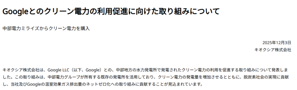 キオクシアは2040年度に再エネ比率100%、2050年度に事業活動の温室効果ガスネットゼロを掲げており、今回の電力調達はその達成に寄与する位置づけとなる。また24時間稼働する発電所の電力をキオクシアが利用することは、GoogleのScope3排出量削減にもつながり、同社のバリューチェーン全体でのネットゼロ化に向けた取り組みを補完する構図となる。両社は今後、日本の既存インフラを活用したクリーン電力の拡大に向け、実践的な導入手法を検討し連携を強化する方針を示している。