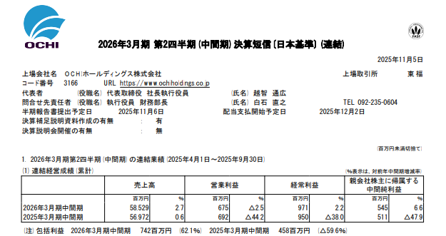【決算】OCHIホールディングス:26年3月期中間期は増収も建材苦戦で営業減益