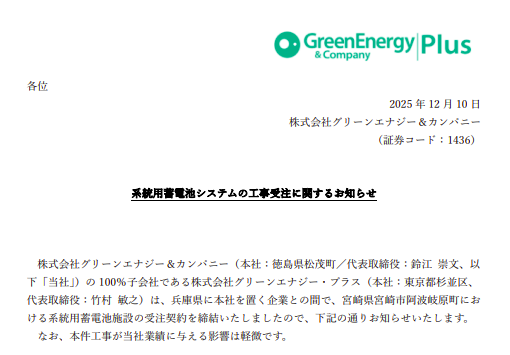 【蓄電関連】グリーンエナジー&カンパニー:系統用蓄電池工事を受注