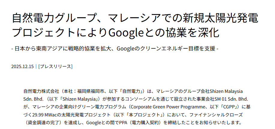 自然電力は、マレーシアで進める新たな太陽光発電プロジェクトを通じ、Googleとの協業を日本から東南アジアへと拡大した。現地グループ会社が参画するコンソーシアムを通じて設立された事業会社が、企業向けグリーン電力制度に基づく29.99MWacの太陽光発電事業で資金調達を完了し、Googleと電力購入契約を締結した。マレーシアの同制度においてGoogleが締結した初期のPPAの一つとされ、2024年に日本で実現した協業に続く動きとなる。自然電力にとっては、成長市場であるマレーシアにおける初の大規模太陽光案件であり、東南アジア展開の節目と位置づけられる。