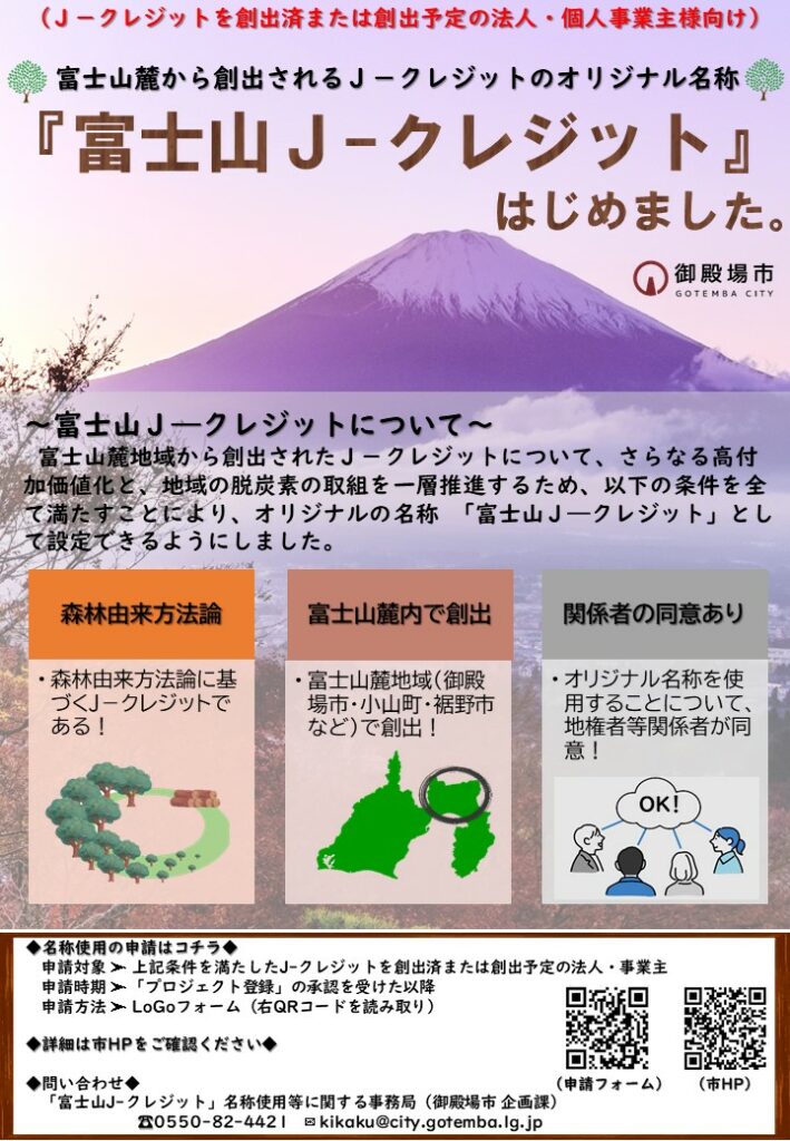 「富士山J-クレジット」として扱うには、森林由来の方法論に基づくJ-クレジットであること、御殿場市や小山町、裾野市など富士山麓地域の行政区域内で創出されること、名称使用について地権者など関係者の同意を得ていることが条件となる。条件を満たせば法人や個人事業主が利用可能で、国からプロジェクト登録の承認を受けた後、市の事務局へ申請する。地域の森林保全やゼロカーボンシティ推進への波及効果を期待し、富士山の名称を生かした認知度向上と差別化を進める考えとしている。