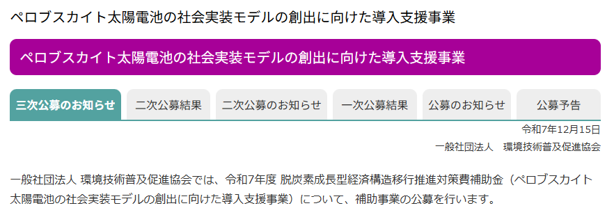 ▷ペロブスカイト太陽電池の社会実装モデルの創出に向けた導入支援事業の公募について(三次公募)
