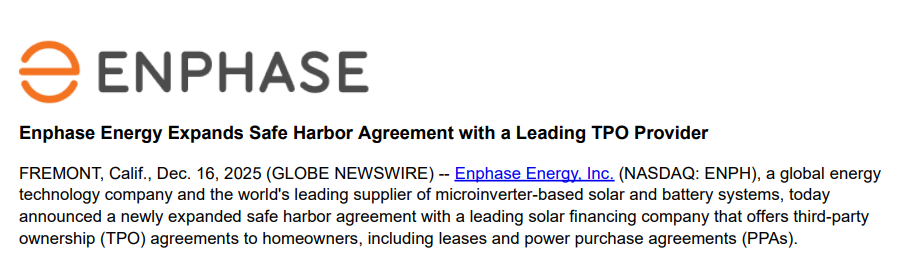 Enphase Energy Expands Safe Harbor Agreement with a Leading TPO Provider