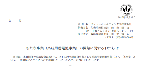 【蓄電関連】ダントーホールディングス:系統用蓄電池事業に参入、兵庫・三田で初号案件