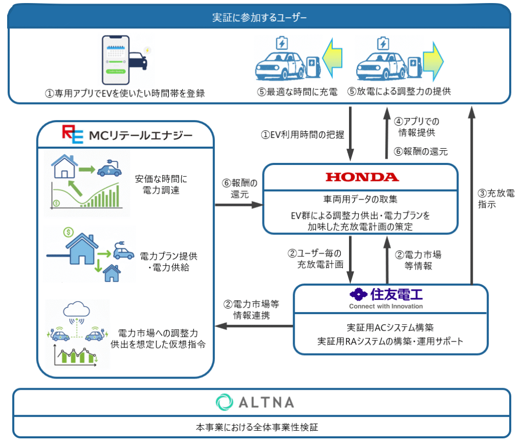 MCリテールエナジーは、住友電工、本田技研工業、ALTNAソリューションズと共同で、個人が所有する複数の電気自動車(EV)を活用したVehicle to Grid(V2G)の実証を12月に開始した。東京都のGX関連産業創出に向けた支援事業の採択案件として、EVに蓄えた電力を家庭や地域の電力ネットワークへ供給する仕組みの実用性と事業性を検証する。実証では複数台のEVを同時制御し、卸電力市場での取引を通じて、再生可能エネルギーの需給ギャップ解消や電力系統の負荷低減への貢献を探る。