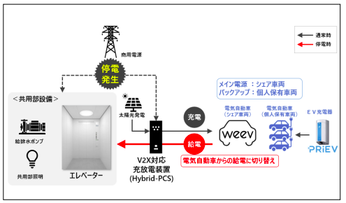 本サービスでは、シェアリング用EVとV2Xシステムを接続し、災害時や停電時にエレベーターなどの共用設備へ給電する仕組みを構築する。入居者が保有するEVからの給電も可能とし、レジリエンス向上を図る。さらに、ビル設備やEVから得られるデータを活用し、日立のデジタルサービスを通じて省エネや新たな付加価値の創出につなげる。EVを起点としたエネルギー活用により、環境対応と快適性を両立したマンション運営を目指す。