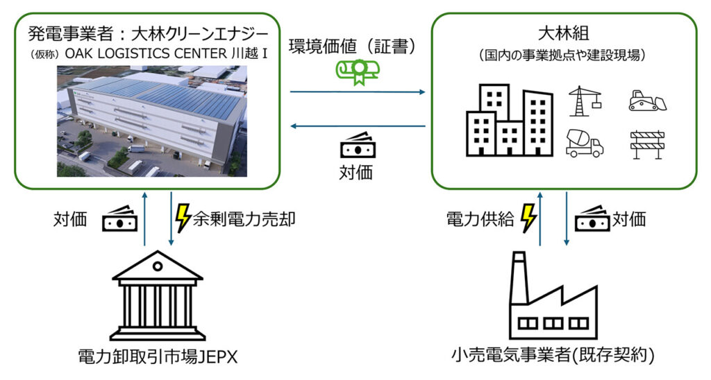 大林組は、FIP制度を活用したバーチャルPPAにより、再生可能エネルギーの環境価値を取得する取り組みに着手した。自社で開発を進める物流施設「(仮称)OAK LOGISTICS CENTER川越Ⅰ」の屋根上に、グループ会社の大林クリーンエナジーが太陽光発電設備を設置し、発電した電力を施設に供給する。施設で使い切れない余剰電力は電力卸取引市場で売却し、その際に生じる環境価値を大林組が受け取る仕組みとする。オンサイト供給とバーチャルPPAを組み合わせることで、同社の国内事業拠点や建設現場を含めた広範な環境価値の活用につなげる。