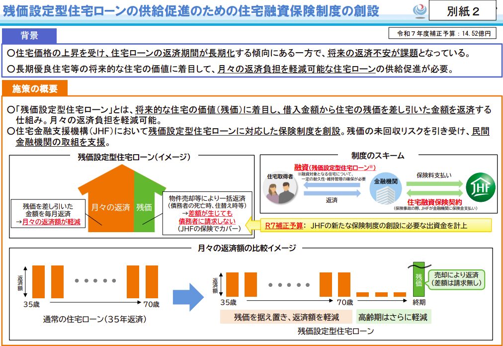 あわせて、月々の返済負担を抑えられる「残価設定型住宅ローン」の普及を後押しする。令和7年度補正予算を活用し、将来の住宅価値が当初想定を下回った場合に金融機関の損失を補填する住宅融資保険制度を創設する。借入額から将来価値を差し引いて返済する仕組みを支えることで、民間金融機関による商品の提供を促進する狙いとされる。さらに、国土交通省と金融庁が連携し、金利リスクに関する理解促進を目的とした普及啓発にも取り組む。