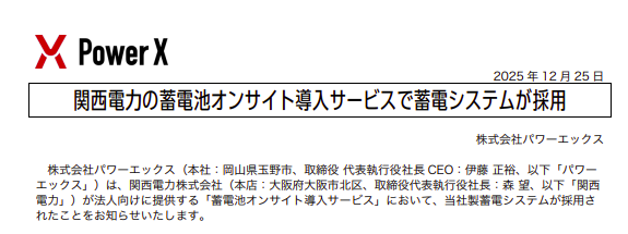 パワーエックスは、関西電力が法人向けに展開する「蓄電池オンサイト導入サービス」において、同社製の蓄電システムが採用された。高圧・特別高圧契約の法人を対象に、初期投資を伴わず事業所敷地内へ蓄電池を設置・運用できる点が特徴で、電力コスト削減や需給最適化を目的とする。今回採用されたのは、中型蓄電システム「PowerX Cube 360」とコンテナ型の「Mega Power 2700A」で、国内開発・製造による幅広い需要対応力が評価された。