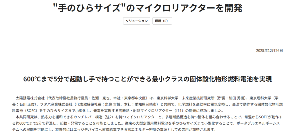 太陽誘電は、東京科学大学、東京理科大学、フタバ産業と共同で、固体酸化物形燃料電池(SOFC)を手のひらサイズまで小型化したマイクロリアクターの開発に成功した。常温から約600℃まで5分で昇温し起動できる点が特徴で、体積は約5×5×5センチと最小クラスとされる。高断熱・耐熱構造を採用することで、従来は大型定置用途に限られていたSOFCの小型化と高速起動を両立させた。