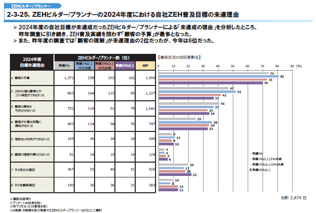 ZEHビルダー/プランナーの自己評価を分析すると、2024年度に自社目標を達成した理由として最も多かったのは「ZEH仕様の標準化」や「社内勉強会の実施」など社内体制の整備だった。顧客対応では、ZEHのメリット訴求や補助金活用が効果を上げている。