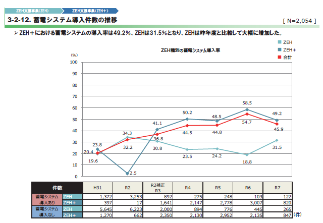 とはいえ本データは昨年度の話。住宅性能評価・表示協会が公表する「ZEH」シリーズのBELS取得統計データをみると25年度はQ3(4月~12月)までに約14.5万戸で推移。新設戸数が約35万戸程度であれば今2025年度に「過半数」を達成している可能性は高い。