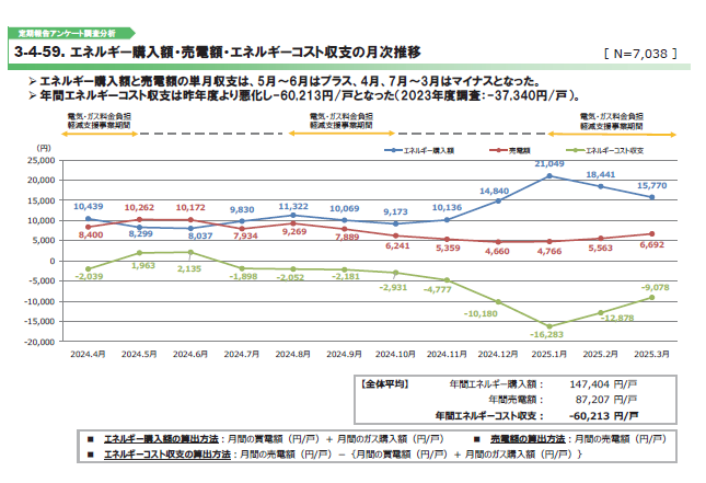 一方、「我慢の省エネをしなくても光熱費が抑えられている」と6割以上が回答するなど満足度は高水準を維持したが、年間のエネルギー収支はマイナス6万円程度と前年より悪化した。単月では5〜6月がプラスとなる一方、冬季を中心にマイナスが続き、発電量と冷暖房需要の季節差が収支に影響している。