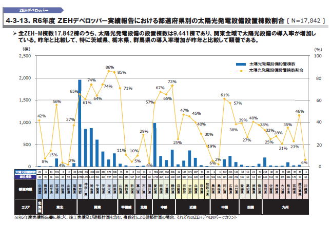 地域別では、関東エリアが7,548棟と全体の約4割を占めた。全ZEH-M棟数のうち、太陽光発電設備を導入した棟数は9,441棟にのぼり、関東全域で導入率が上昇した。中でも茨城、栃木、群馬の3県では前年からの伸びが顕著だった。