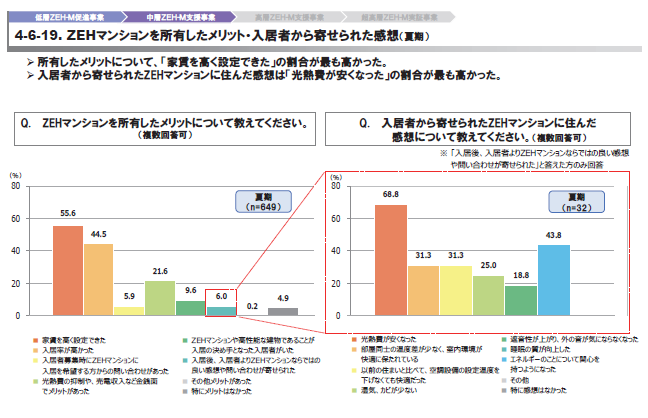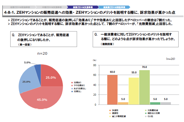 オーナー側では、「家賃を高く設定できた」との回答が最多となり、資産価値や収益性への寄与が意識されている。補助事業者の8割以上がZEHマンション建設に満足していると回答し、太陽光発電やEV充電設備の導入理由としては「居住者満足度の向上」や「EV普及を見据えた将来対応」が挙げられた。販売促進面でも、約7割のデベロッパーがZEHマンションであることが「効果があった」としている。