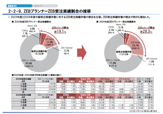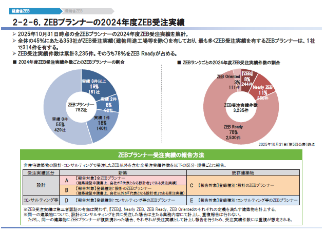 ZEBリーディング・オーナーの登録は増加。同時点の登録事例は771件(540オーナー)に上り、『ZEB』:181件、Nearly ZEB:175件、ZEB Ready:401件、ZEB Oriented:14件と、高水準の省エネを志向する動きが一定数確認された。オーナー主導でZEBを目指す案件が増え、発注側の理解と経験値が蓄積しつつある。