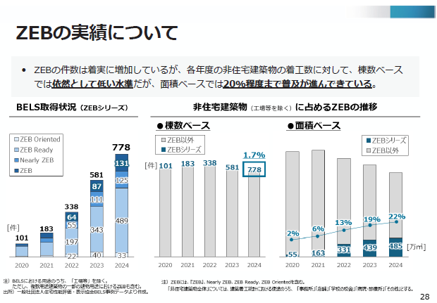 建物全体では、ZEB件数は非住宅着工棟数に対して依然低水準にとどまる一方、延べ床面積ベースでは約20%まで普及が進んだ。2024年度のBELS取得件数は778件で、棟数比は1.7%だが、面積は485万平方メートルに達する。規模を問わず一定程度ZEB化が進んでいる構図が浮かぶ。