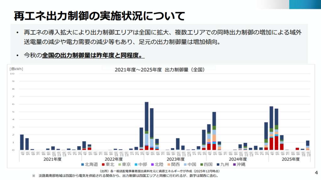 再エネ導入拡大に伴い、出力制御の実施エリアは全国に広がり、複数エリアで同時に制御が行われるケースが増加している。足元では域外送電量の減少や電力需要の低下も重なり、出力制御量は増加傾向にあるものの、2025年秋時点の全国の制御量は前年度と同程度と整理された。