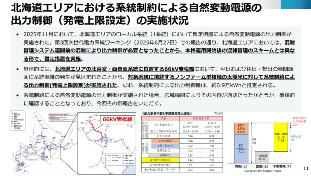 北芽室・西音更系統の66キロボルト岩松線で系統混雑が見込まれたため、ノンファーム型接続の太陽光に対し発電上限設定が行われ、制御量は約0.9万キロワット時と推定された。実施内容については、広域機関が事後検証を行うとされた。