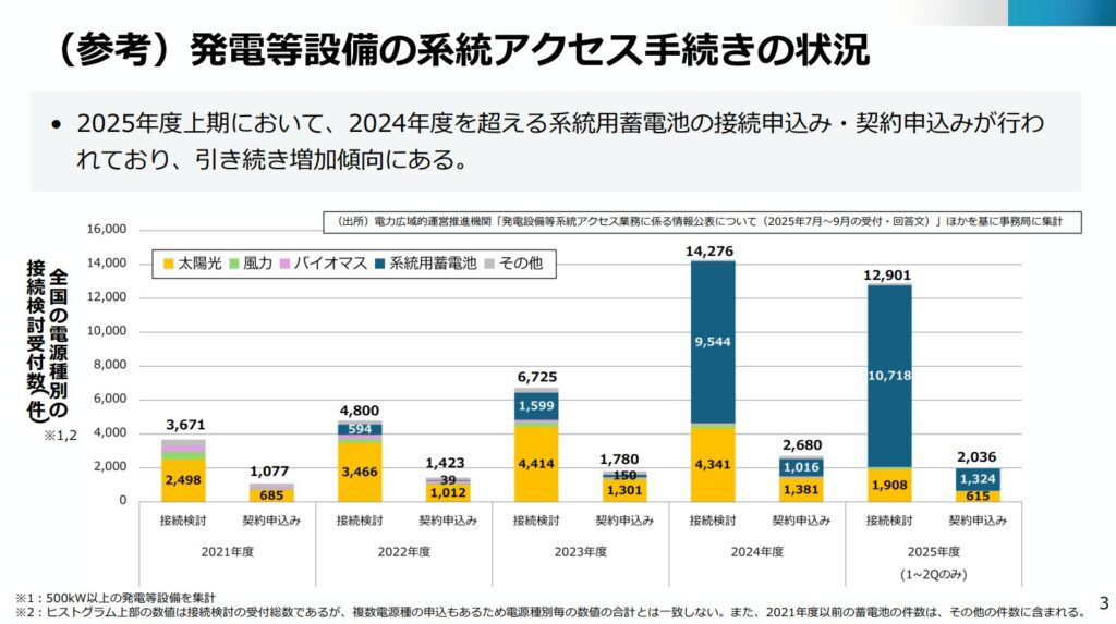系統用蓄電池を巡っては、接続検討や契約申込みが急増している現状を踏まえ、系統アクセス手続きの規律強化が主要議題となった。2026年1月5日以降に受け付ける案件から、接続検討申込み時に設置場所の登記情報など土地に関する書類提出を要件化することが確認された。