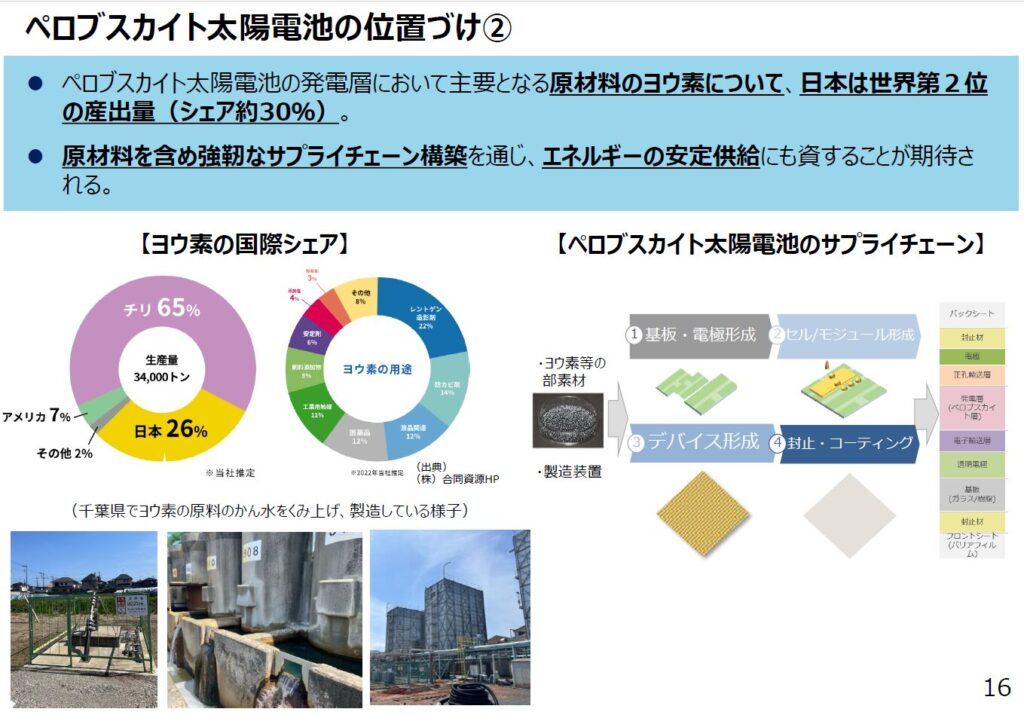 主要材料の一つであるヨウ素は日本が世界第2位の産出量(シェア約30%)を誇るという。エネルギー資源の多くを輸入に頼る日本にとって「国産原料で作れる太陽電池」という物語は、エネルギー安全保障と結び付く。