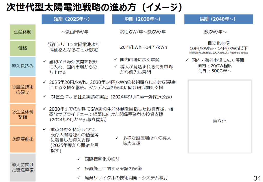 「2025年までに20円/kWh、2030年までに14円/kWhが可能となる技術を確立させる。生産体制についても、2030年を待たずにGW級の構築を目指す」