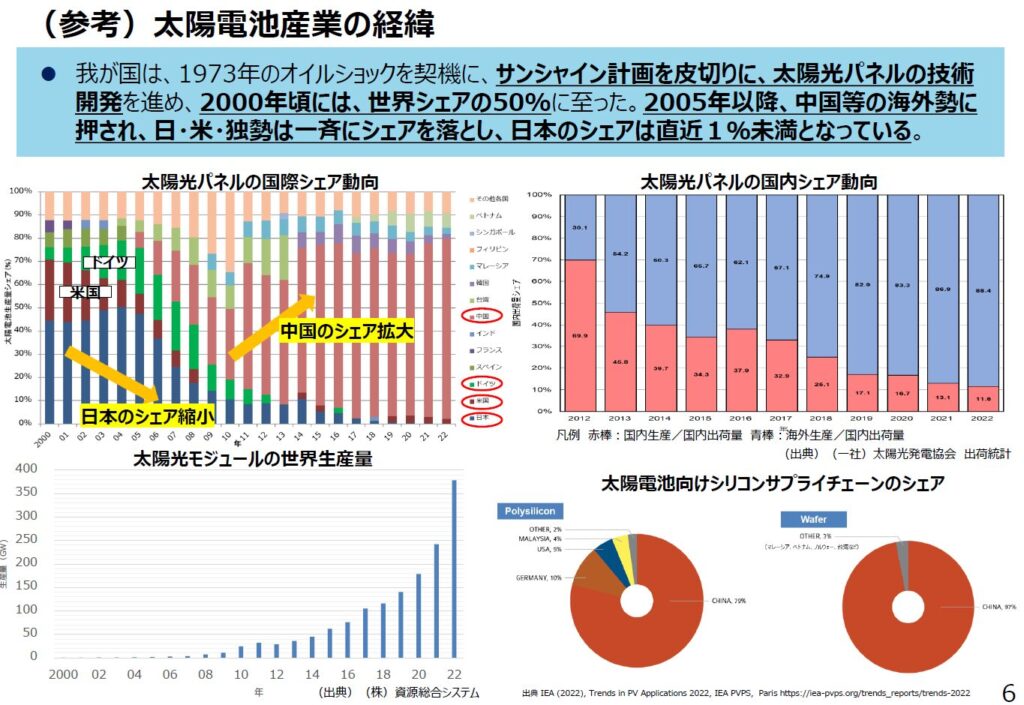 「技術で勝って勝負で負けた」と言えば華々しいが「2005年以降、中国等の海外勢に押され、日・米・独勢は一斉にシェアを落とし、日本のシェアは直近1%未満」「原料であるシリコン・ウエハも9割が中国またはその他の企業で構成されている」との現状が分析されている。
