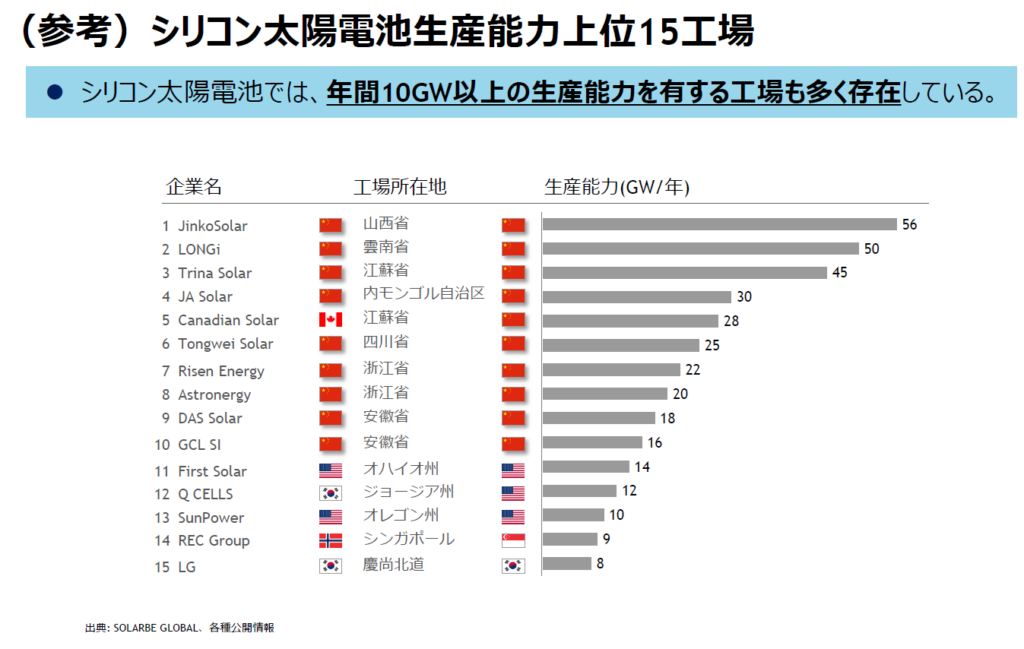 世界の発電コストはすでに10円/kWh以下まで低下。また海外では1社単独で50GWを遥かに超え100GW級の巨大な生産キャパシティが構築されているケースもある。