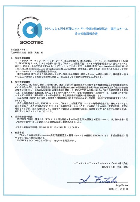 エナリスは、独自に展開する「ハイブリッド・オフサイトPPAサービス」について、再生可能エネルギーの発電・供給量算定および運用スキームが「RE100 TECHNICAL CRITERIA 2025」に準拠しているかを確認する第三者検証を受け、妥当性が確認された。検証はソコテック・サーティフィケーション・ジャパンが実施し、限定的保証水準での確認報告書を受領した。