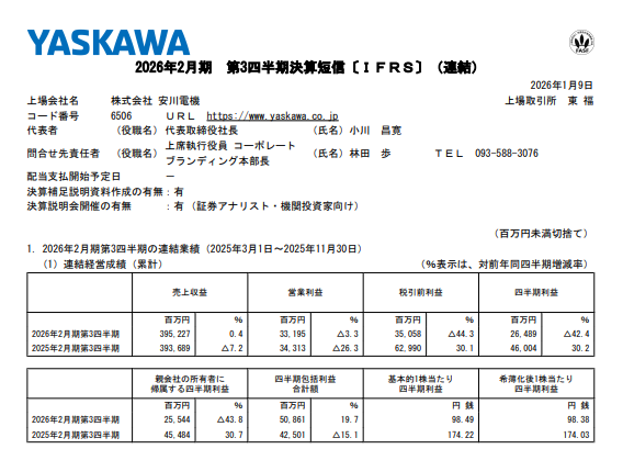 安川電機の2026年2月期第3四半期(2025年3~11月)連結(IFRS)は、売上収益が3952億円と前年同期比0.4%増、営業利益は331億円で同3.3%減となった。親会社の所有者に帰属する四半期利益は255億円(同43.8%減)。前年同期に計上した関連会社株式の一部譲渡益・残存株式の再評価益の反動が響いた。