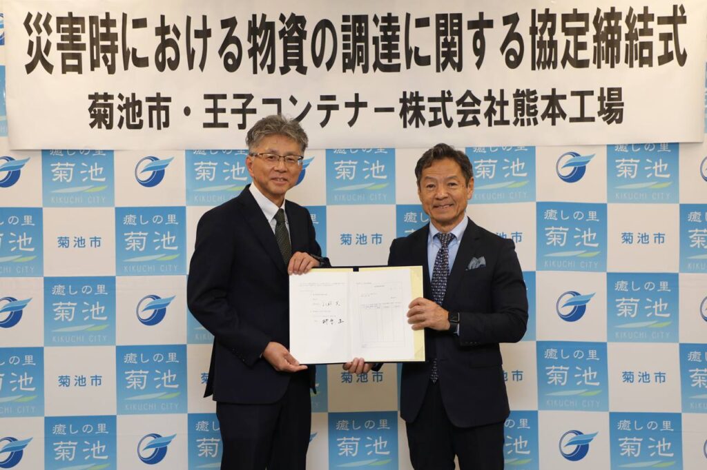 菊池市は、災害発生時の避難所運営体制を強化するため、王子コンテナー熊本工場と「災害時における物資の調達に関する協定」を締結した。締結日は令和7年12月23日。災害やその恐れが生じた場合、市の要請に基づき、段ボールベッドや間仕切りなどの段ボール製品について、優先的な提供を受けられる枠組みを整えた。