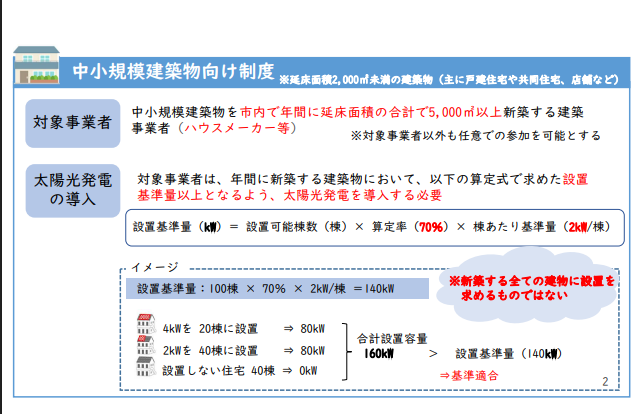 制度は中小規模建築物と大規模建築物の二本立てで整理された。中小規模建築物(延床2,000㎡未満)では、一定規模以上の新築を行う建築事業者に対し、年間の新築棟数に応じた算定式で求めた設置基準量以上の太陽光発電導入を促す。全棟への設置を求めるものではなく、柔軟な組み合わせで基準達成を可能とする点が特徴だ。併せて、省エネ・断熱性能については国が2030年度までに引き上げる基準を前倒しで達成することを求める方向性が示された。