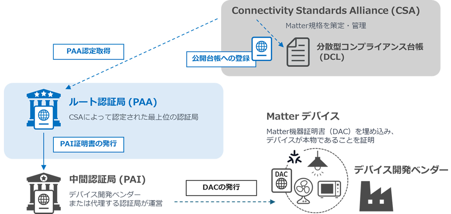 サイバートラストは、スマートホーム分野の業界標準規格「Matter」に対応するルート認証局として、Non-VID Scoped PAA(Product Attestation Authority)の認定を取得した。Matter対応製品の開発ベンダー向けに中間認証局証明書を発行できる認証局で、日本国内の商用電子認証局としては初の認定となる。これにより、同社はMatterの標準化団体であるConnectivity Standards Alliance(CSA)が運営する分散型コンプライアンス台帳(DCL)に、信頼された認証局として登録された。