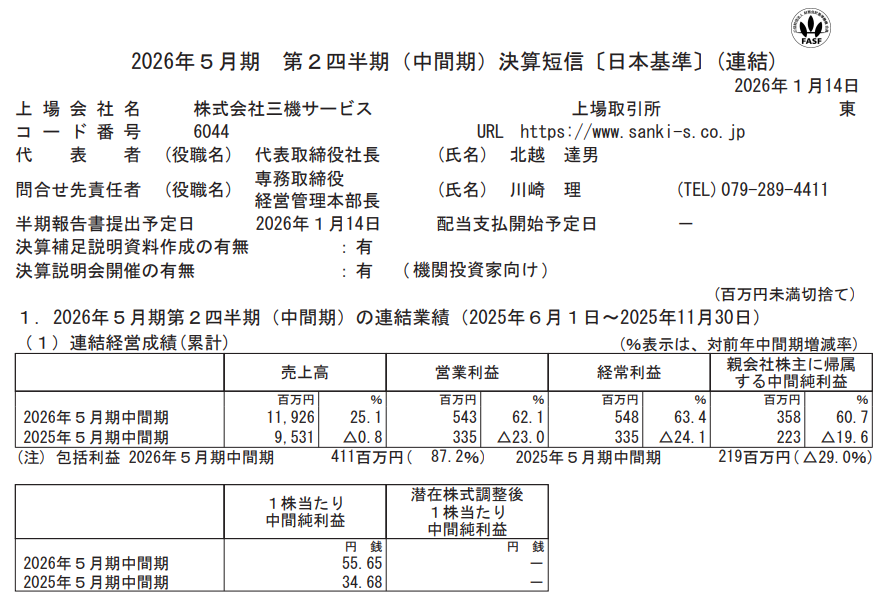 三機サービスの2026年5月期第2四半期(中間期)連結業績は、売上高が119億円と前年同期比25.1%増加した。大型設備更新案件の受注拡大に加え、メンテナンスサービスの需要が堅調に推移し、営業利益は5億円超と6割以上伸長した。エネルギーコスト高を背景に、省エネや予防保全を含む付加価値型サービスへの引き合いが増加している。