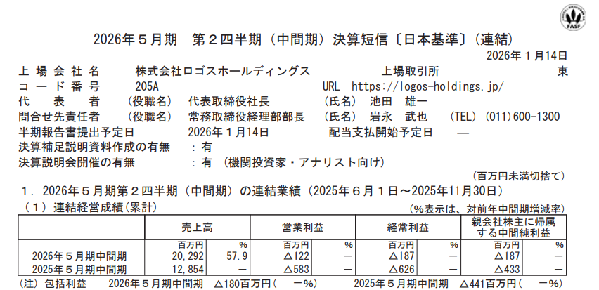 【決算】ロゴスホールディングス:中間は売上58%増、赤字縮小も販管費先行