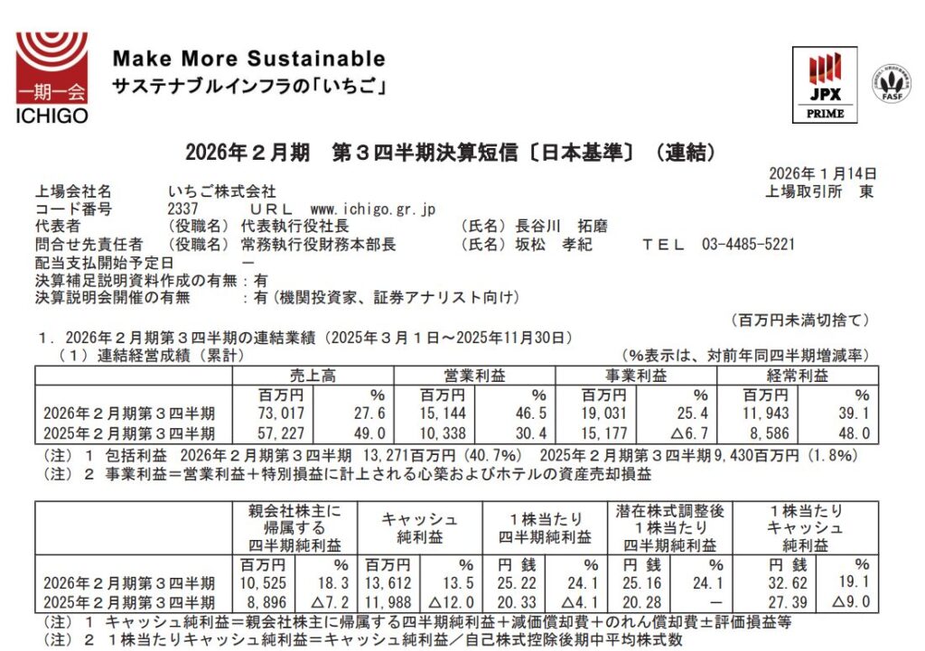 いちごの2026年2月期第3四半期(累計、2025年3月1日〜11月30日)は、売上高が730億1700万円(前年同期比27.6%増)、営業利益151億4400万円(46.5%増)となった。保有物件の賃料収入の伸長に加え、ホテルの収益改善、新規取得物件の寄与がストック収益を押し上げた。東京都心の新築レジデンス売却や価値向上を進めた資産の売却が進み、フロー収益も拡大した。