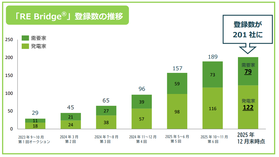 デジタルグリッドは、法人向けコーポレートPPAを促進する再生可能エネルギー取引のマッチングプラットフォーム「RE Bridge」の登録数が、2025年12月末時点で200社を超えたと発表した。登録対象は発電事業者と需要家で構成され、オークション形式による価格合意を前提とした商談機会を提供する。入会金や年会費を不要とし、所定の審査を経た企業が参加できる仕組みとなっている。