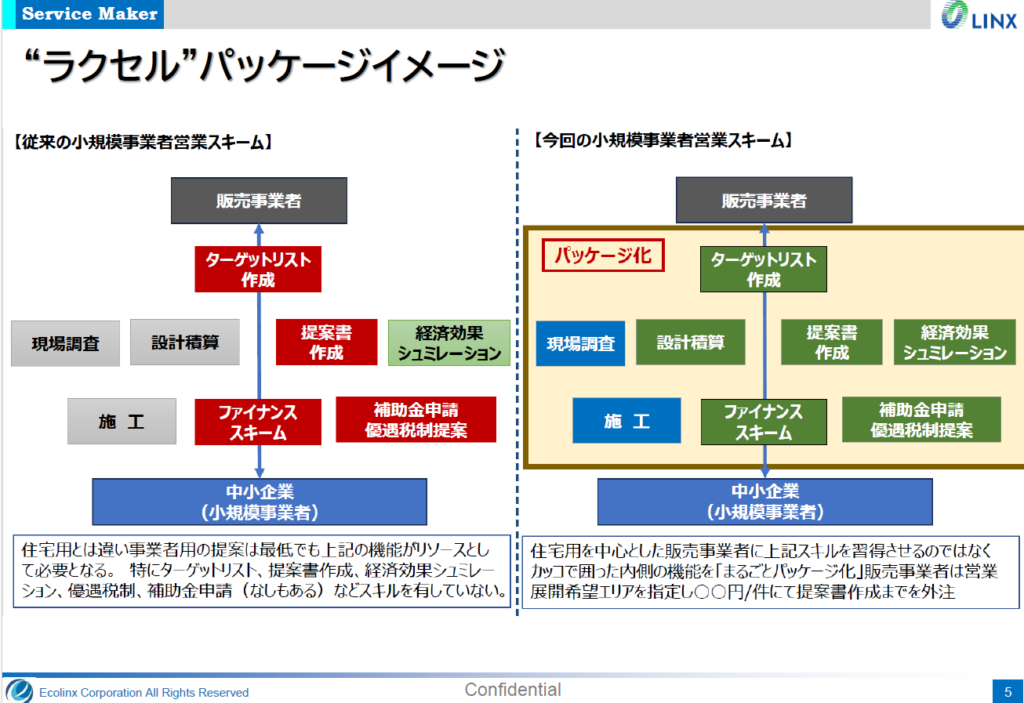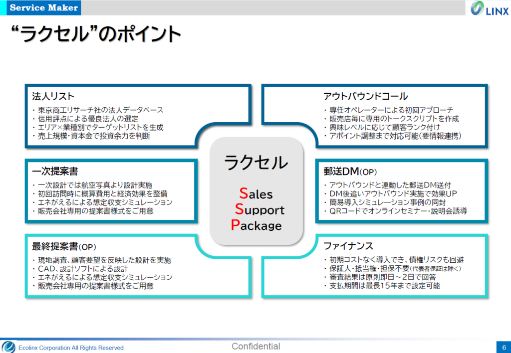 事業者の研修育成事業から太陽光発電の販売・施工の支援を手掛けてきたエコリンクスは今冬、住宅販売会社向けに産業用太陽光発電の「売る仕組み」を一括サポートする『ラクセル(Sales Support Package)』を開始。