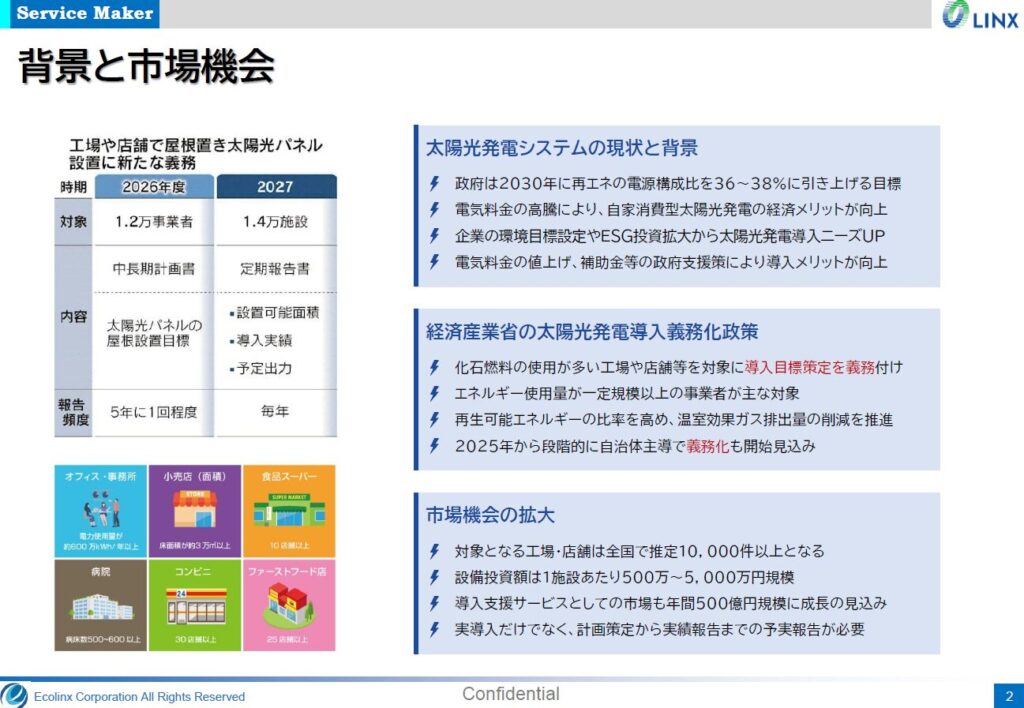 対象となる工場や店舗は特定事業者と呼ばれ、全国で1万件以上ある。1件当たりの設備投資額は数百万円から数千万円規模。計画策定から実績報告までを含めた導入支援サービスは年500億円規模に成長する見通し。