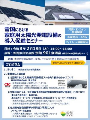 新潟県は、雪国における家庭用太陽光発電設備の導入促進を目的とした事業者向けセミナーを、令和8年2月19日に開催する。住宅の設計・施工や太陽光発電設備の施工に携わる事業者を対象とし、県と関係業者が連携して導入拡大に取り組む姿勢を示す。会場は新潟県自治会館別館とし、オンラインを併用した形式で実施する。今後の提案力向上や事業展開に資する内容として、参加を呼びかけている。