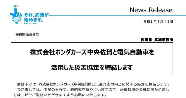 武雄市は、ホンダカーズ中央佐賀と電気自動車を活用した災害対応力向上に関する協定を締結する。災害時における電力確保や市民の移動手段の確保を目的とし、1月19日に締結式を行う予定とした。協定により、地域避難所などにおいて電力供給手段を確保し、非常時の生活環境維持につなげる考えを示している。