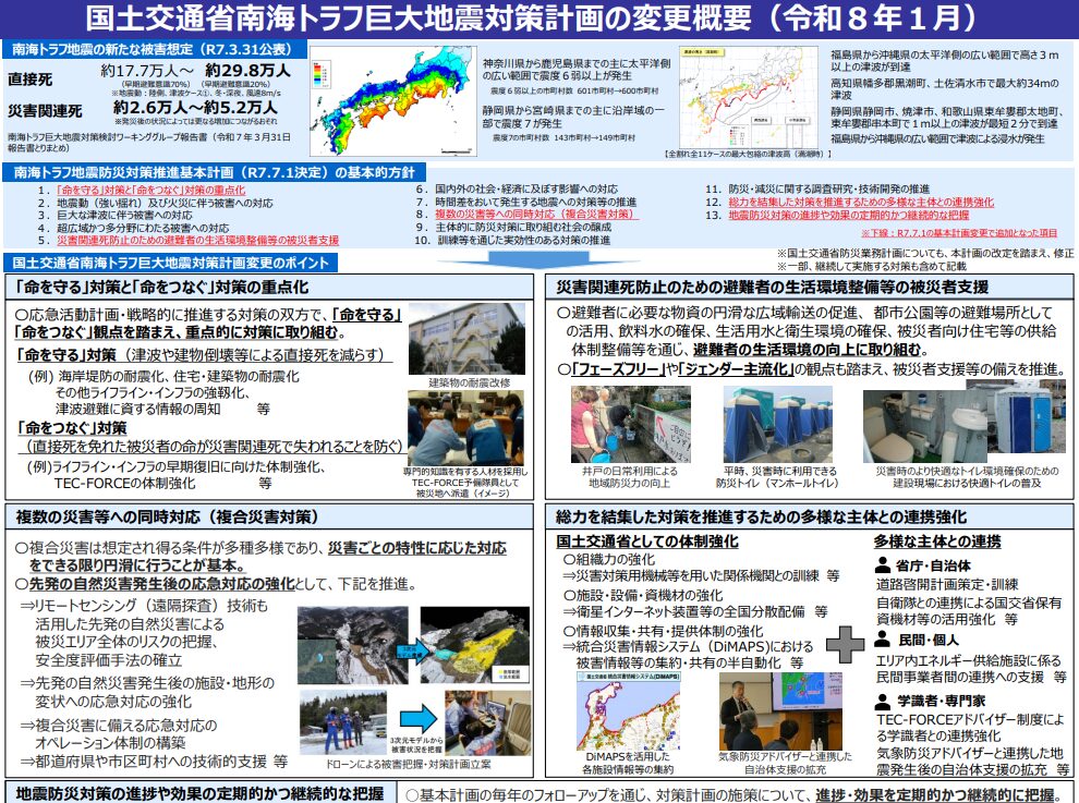 国土交通省は、南海トラフ巨大地震への備えを強化するため、同省の対策計画を改定した。令和7年7月に中央防災会議で変更された南海トラフ地震防災対策推進基本計画を踏まえ、1月16日に防災・減災対策本部を開催し、省を挙げた対応方針を整理した。国家的危機に備える枠組みとして、引き続き地震・津波対策の強化を進める。