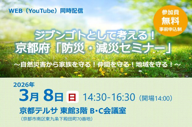 日本損害保険協会近畿支部京都損保会は、京都府や関係団体と連携し、府民の防災・減災意識の向上を目的とした「京都府 防災・減災セミナー」を3月8日に開催する。地震や台風、大雨など自然災害の発生リスクが高まるなか、災害が発生する時期や場所を特定できない現状を踏まえ、一人ひとりが防災を身近な課題として考える機会を提供する。家族や地域を守る行動につなげることを狙い、行政、学識経験者、保険業界が一体となった情報発信を行う。会場は京都テルサで、定員80人の現地参加に加え、オンライン配信を併用するハイブリッド形式とする。参加費は無料で、事前申込制により幅広い府民の参加を受け付ける。
