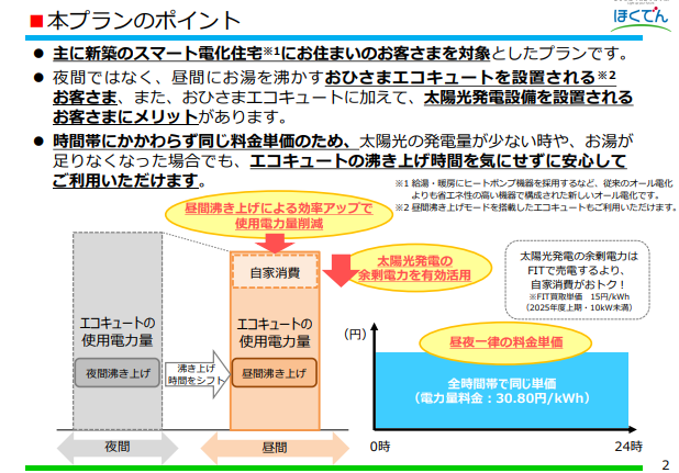 本プランは、夜間料金を前提とした従来型オール電化とは異なり、昼間シフトによる省エネを軸に据えた構成となる。電力量料金は1kWh当たり30.80円で、電気料金に応じたポイント付与制度も設けた。おひさまエコキュートと太陽光発電を併設するスマート電化住宅では、都市ガスや灯油・LPG併用と比較して光熱費負担の低減が見込まれるとしている。