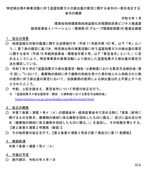 環境省は、特定排出者の事業活動に伴う温室効果ガス排出量の算定方法を定めた省令の一部を改正し、2026年1月21日に公布した。改正省令は2026年4月1日から施行される。地球温暖化対策推進法に基づく算定・報告・公表制度において、事業者が報告する温室効果ガス算定排出量の考え方を見直すもので、廃棄物焼却に伴う廃熱の取り扱いが焦点となった。